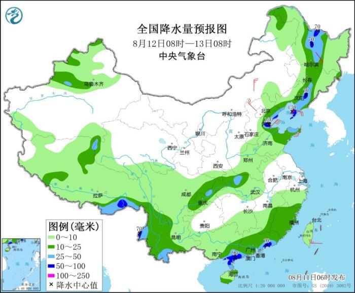 预计,8月11日08时至12日08时,黑龙江西南部和东部、吉林南部、山西东北部、河北中南部和东北部、北京南部、天津、陕西关中地区、甘肃东南部、四川盆地西南部、云南南部、广西南部、广东大部、福建西南部、海南岛北部和西南部等地部分地区有大到暴雨,其中,河北中部、四川盆地西南部、广西东南部沿海等地局地有大暴雨(100~150毫米)。上述部分地区伴有短时强降水(最大小时降雨量20~50毫米,局地可超过60毫米),局地有雷暴大风或冰雹等强对流天气。中央气象台8月11日06时继续发布暴雨蓝色预警。