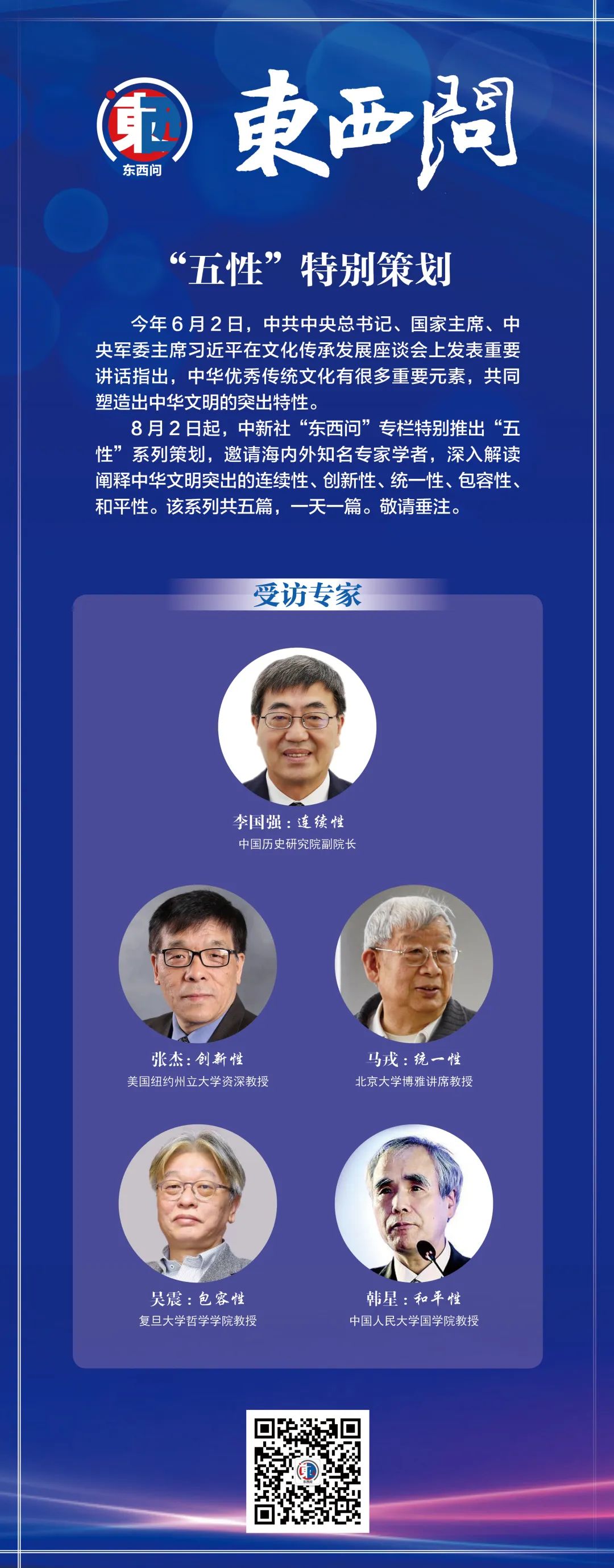 8月2日起,中新社“东西问”专栏特别推出“五性”系列策划,邀请海内外知名专家学者,深入解读阐释中华文明突出的连续性、创新性、统一性、包容性、和平性。该系列共五篇,一天一篇。敬请垂注。