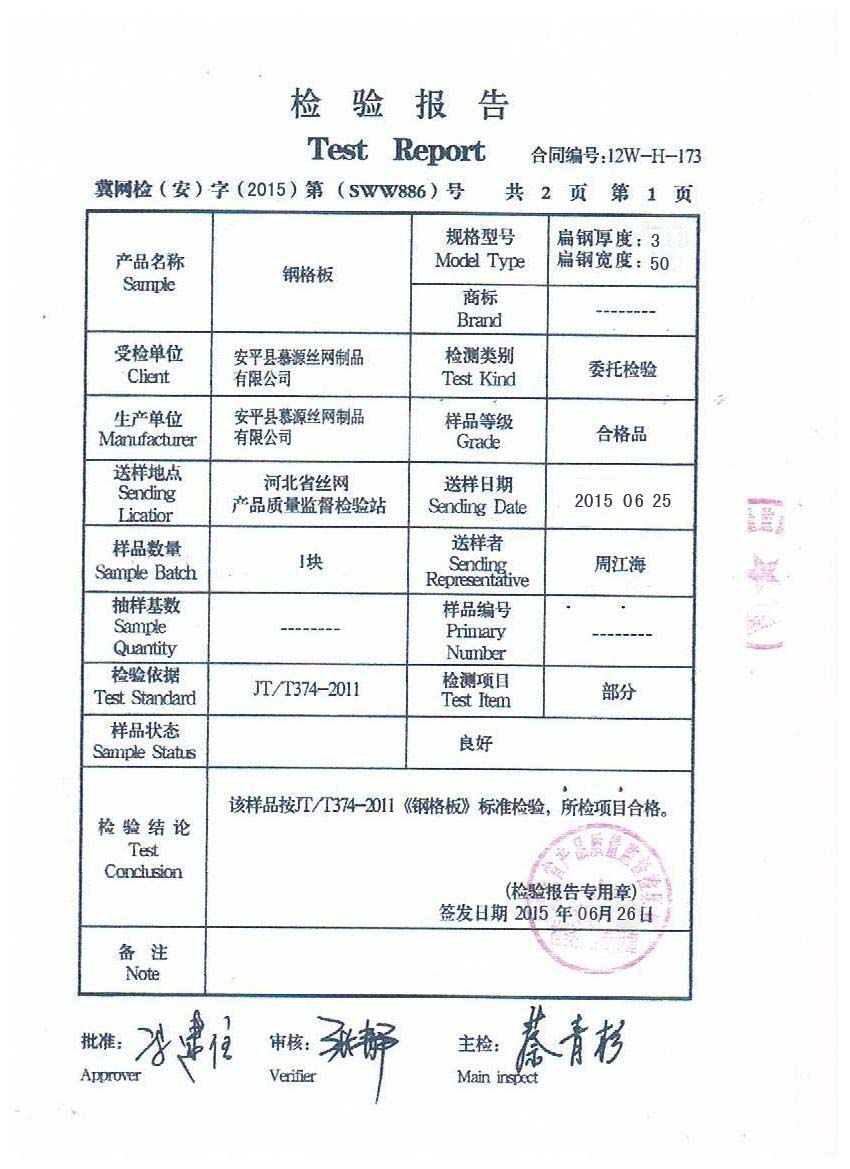对于第一次采购钢格板的客户来说,其对钢格板质量不是太懂,那么钢格板质量检测报告则提供了产品的有效质量保障。广大客户想要对公司产品质量了解,企业的产品质量检测必不可少,检测报告由河北省丝网产品质量监督检验站颁发。