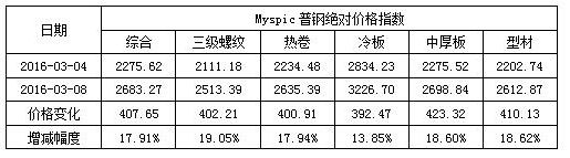 2016年3月初,一把无名之火点燃了钢市,烧遍了全国,短短4天钢价暴涨400多元,Myspic普钢绝对价格综合指数从2275.62元/吨暴涨至2683.27元/吨,涨幅高达17.91%,其中三级螺纹钢、热轧、冷轧、中板以及型材分别上涨19.05%、17.94%、13.85%、18.60%和18.62%。那么这把火究竟是如何烧起来的呢?主要有以下5个因素,具体如下: