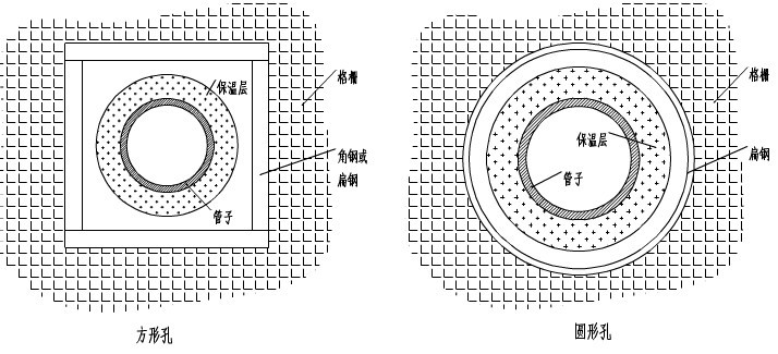 3、管道穿平台处要进行封边处理,封闭工艺美观一致并便于管道的保温和膨胀。一般小径或中径管道及成排管束可做成方形孔,大径管道应做成圆形孔。如图:
