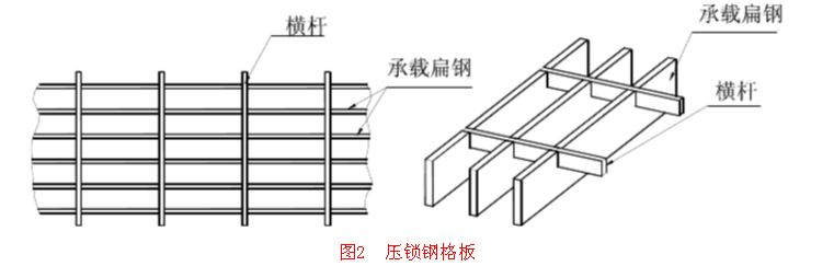 在承载扁钢和横杆的每个交点处,通过压力将横杆压入承载扁钢或预先开好槽的承载扁钢中,将其固定的钢格板,称为压锁钢格板。压锁钢格板的横杆通常采用扁钢。如图2所示: