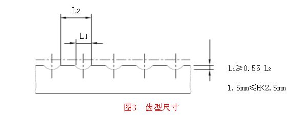 7、钢格板的承载扁钢,可以带有齿型,以增加钢格板的防滑力,齿型尺寸如图3所示。在每100mm内不能少于5齿。 单位为毫米 L1≥0.55 L21.5mm≤H<2.5mm
